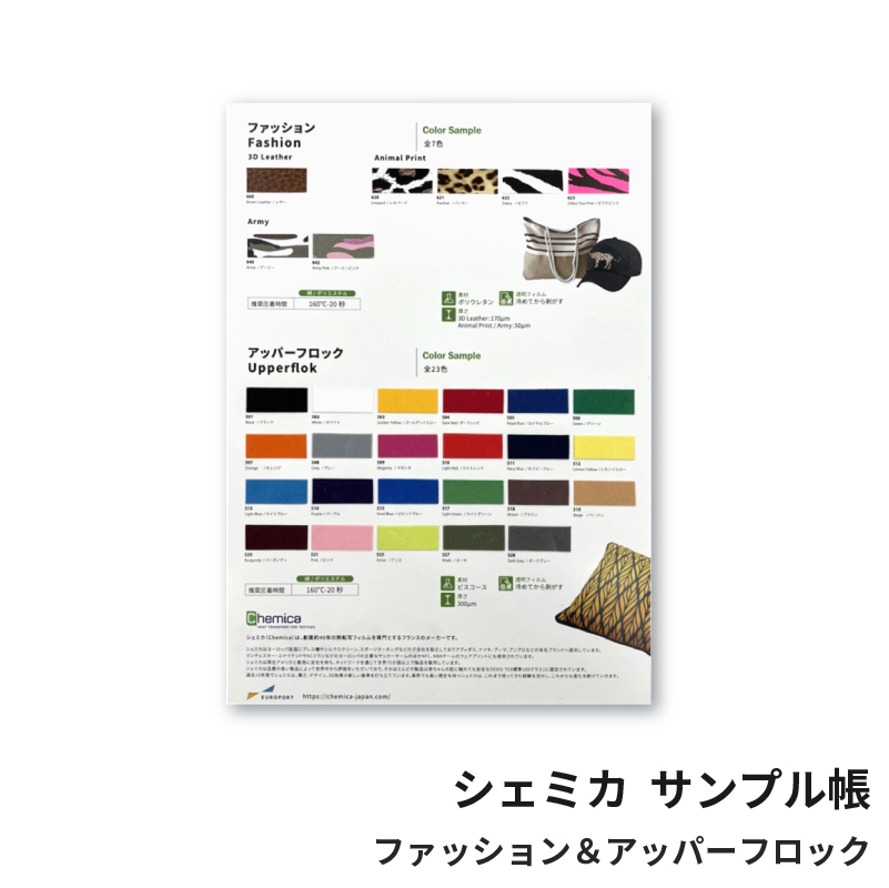 カッティング用アイロンシート「ファッション」、「アッパーフロック」のサンプル帳です。