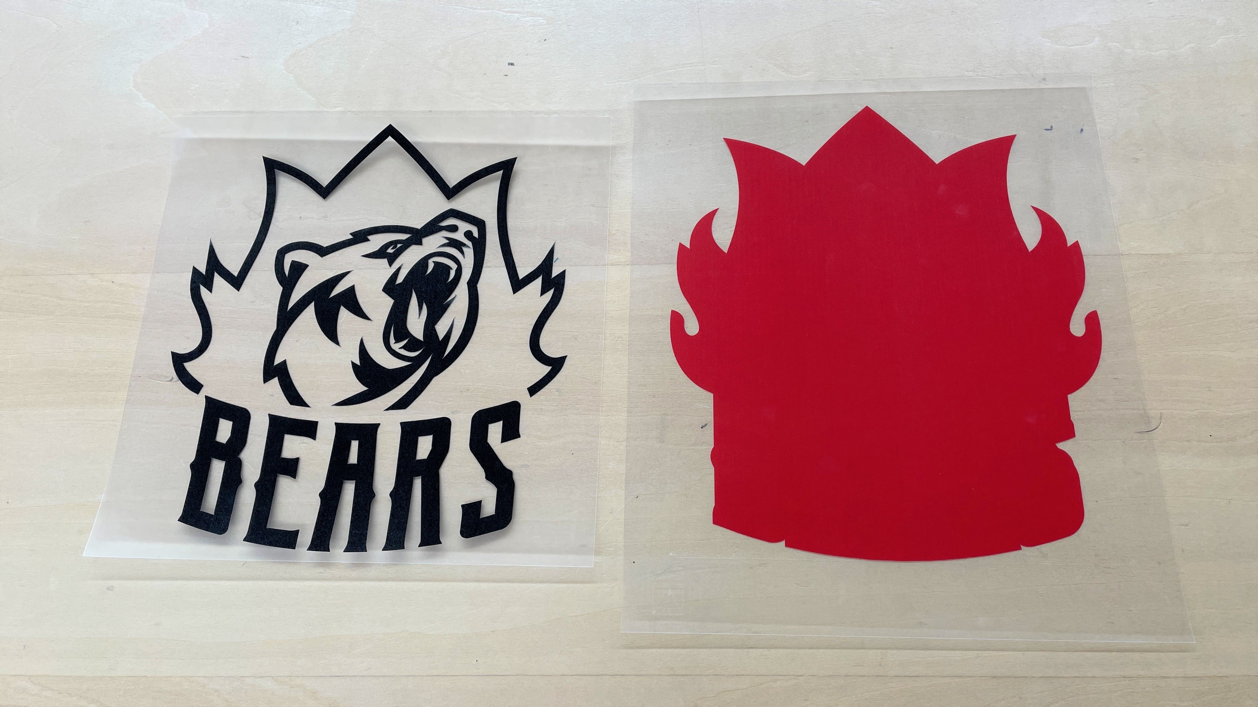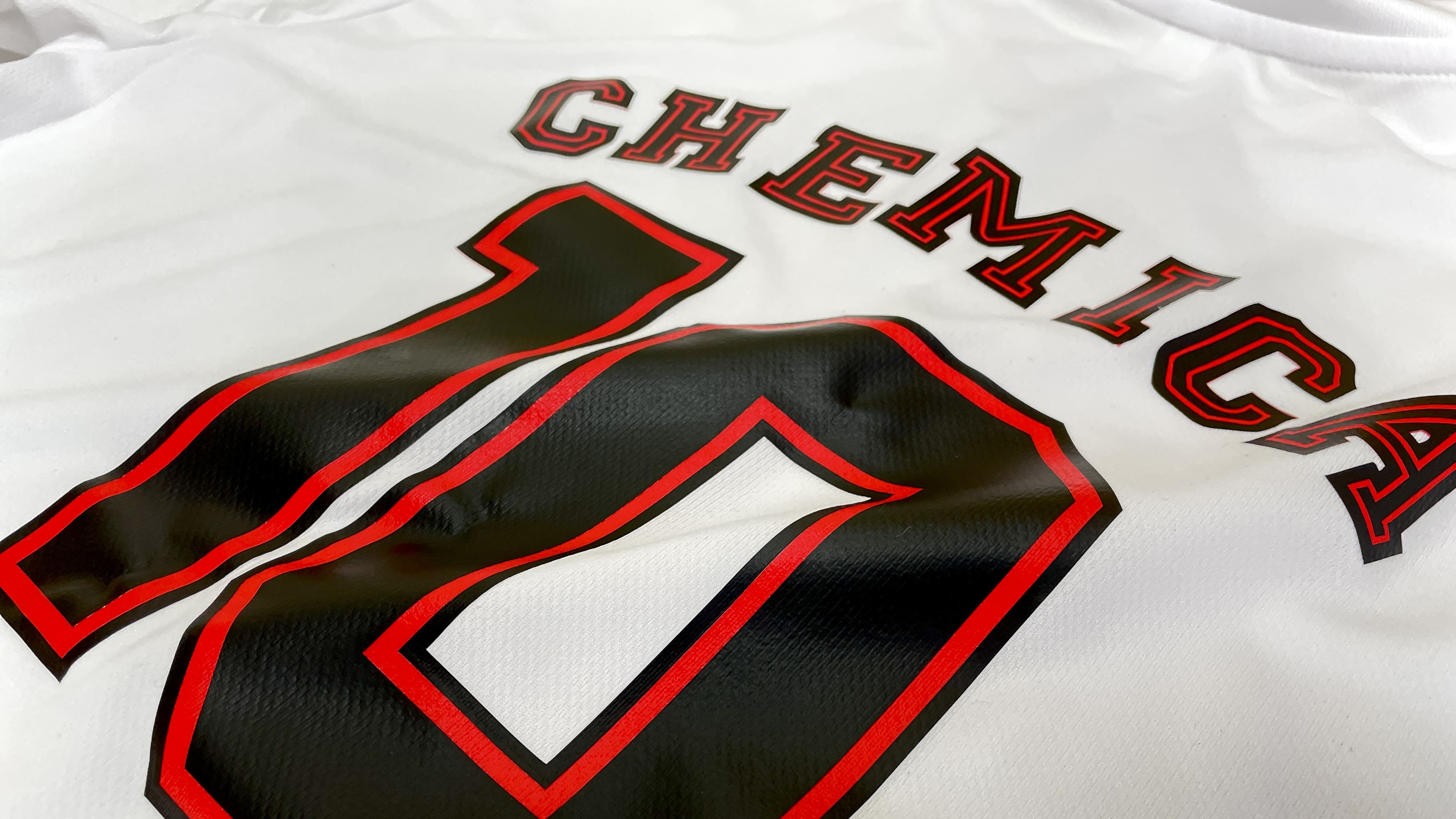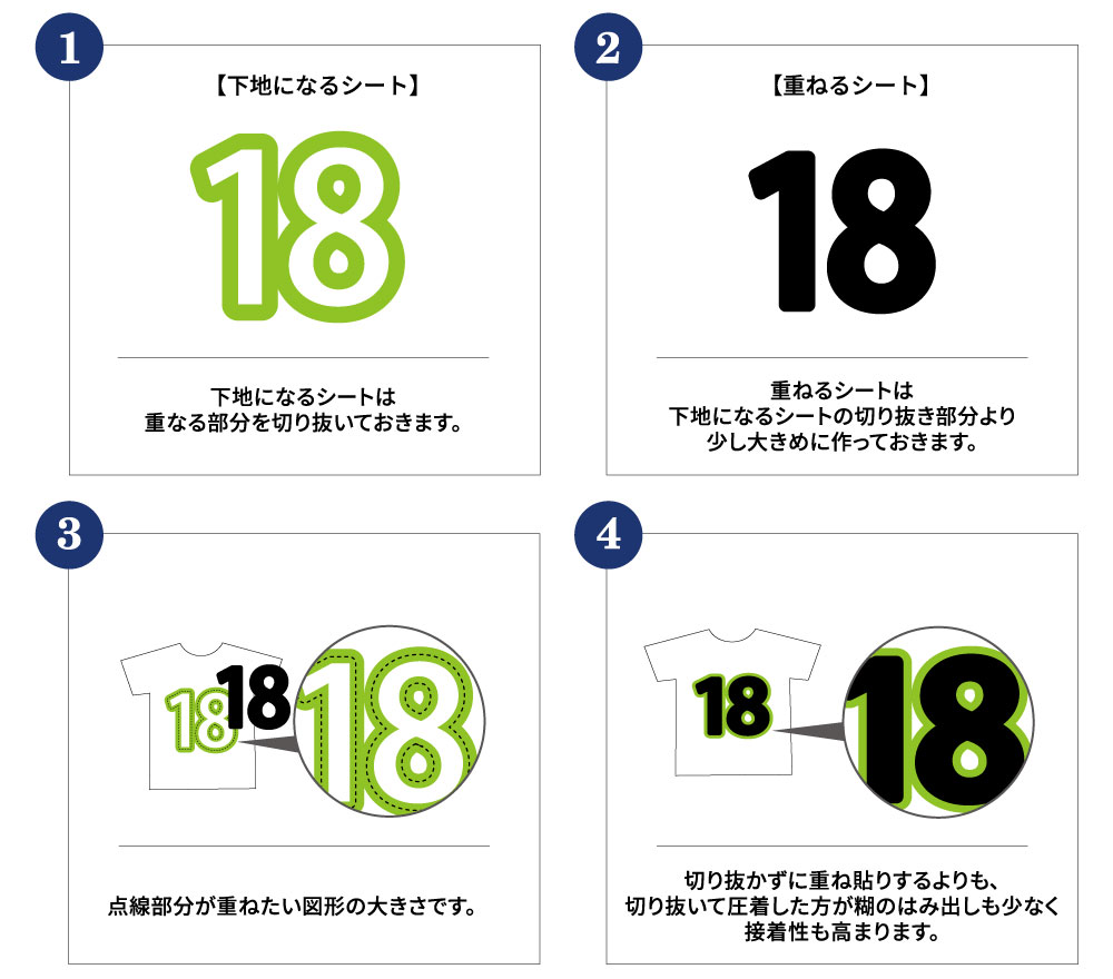アイロンシート(熱転写シート、ラバーシート)でスポーツウェアやユニフォームの背番号、チームロゴなど2色のデザインを行いたいときに、重ね貼りと呼ばれる手法を使います。